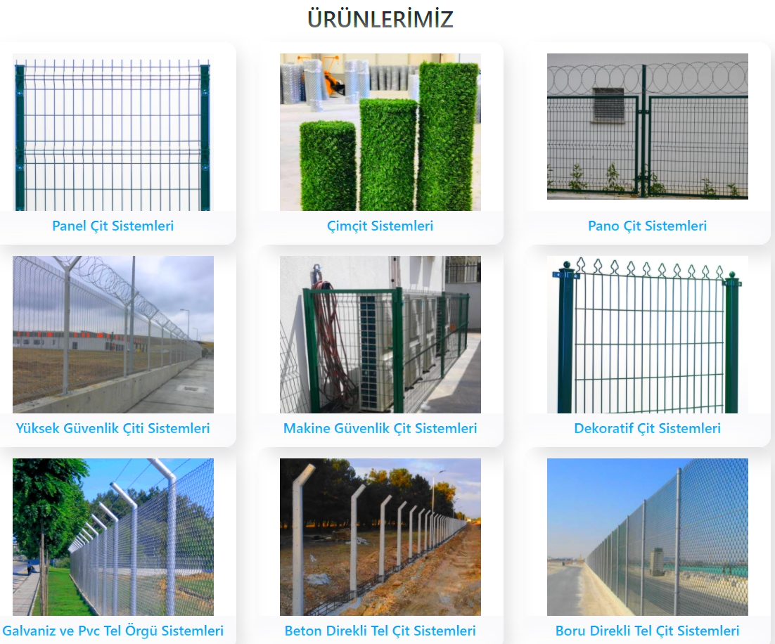Panel çit sistemlerinde tel örgü ve çim çit çeşitleri ile güvenli, dayanıklı ve şık panel çit tasarımlarına imza atan firmamız, farklı et kalınlıkları ve ebatları ile her ihtiyaca uygun panel çit sistemleri üretimi yapıyor. Ev ve iş yerlerinin bahçesini çevreleyen yüksek güvenlikli panel çit sistemlerinden ihtiyaca uygun çim çit sistemlerine kadar tüm panel çit sistemlerinde firmamıza güvenebilir, en ekonomik fiyatlarla standart ya da müşteriye özel panel çitleri satın alabilirsiniz.